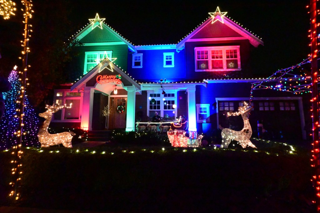 In the Willow Glen district in San Jose there are numerous houses decorated in Christmas lights that brings thousands of walkers and automobiles in the neighborhood. The focal point of the Christmas lights are either on the corner of Glen Eyrie and San Ramon or San Pablo in the San Jose Willow Glen District.