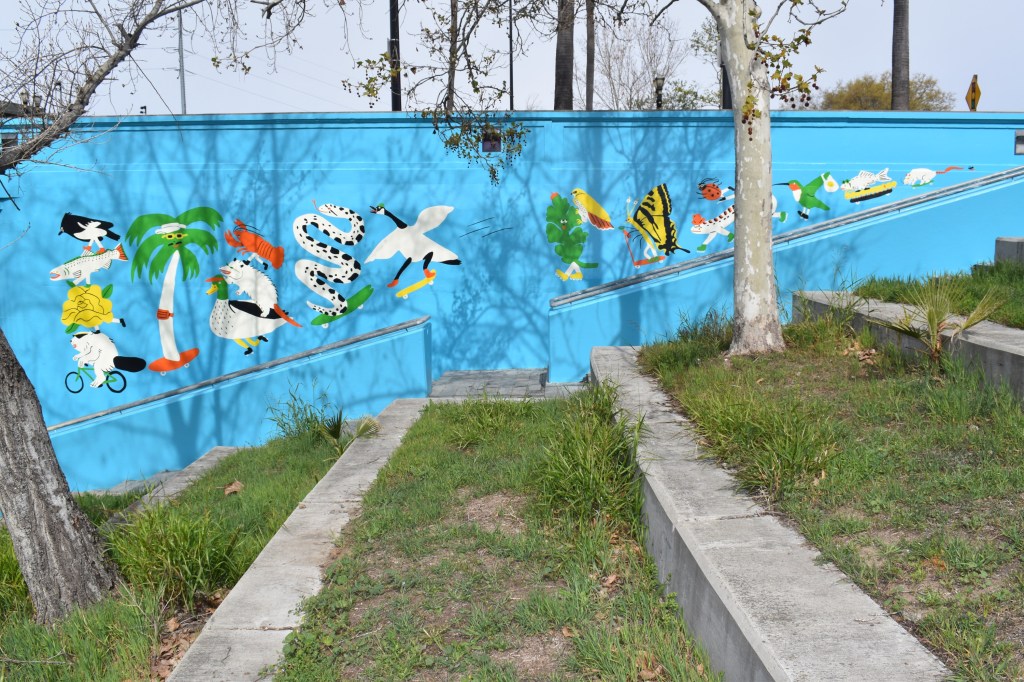 Kristina Micotti is the artist that recently painted the murals at the Guadalupe River Trail at Santa Clara Street near the SAP Center in San Jose. She was commissioned to paint these murals through Pow Wow San Jose and the Guadalupe River Park Conservancy. The murals are located on both sides of the Santa Clara Street underpass and along the Guadalupe River Trail.