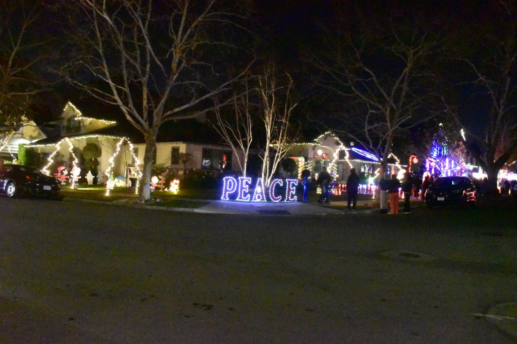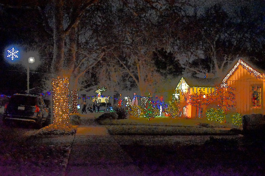 Every Christmas holidays in the Willow Glen district in San Jose there are numerous houses decorated in Christmas lights that brings thousands of walkers and automobiles in the neighborhood. The focal point of the Christmas lights are either on the corner of Glen Eyrie and San Ramon or San Pablo in San Jose.